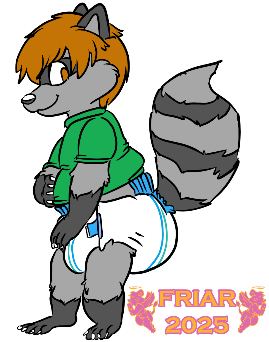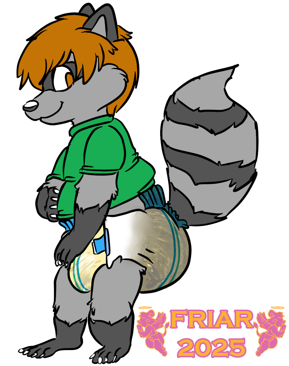 Illustration of Tylahn the wet and messy diapered raccoon squishing his diaper by the treehouse fence at Friar's house.