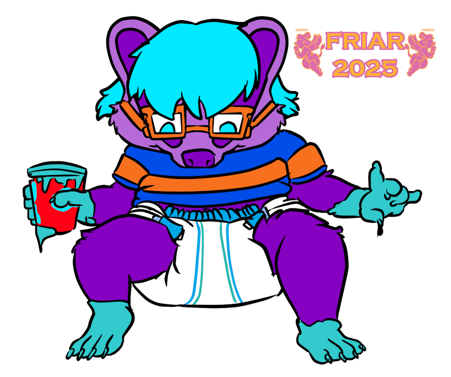 Illustration of Everett the wet and messy diapered badger standing on a large paper and tarp in the treehouse where he is painting with his feet and paws while holding a cup of paint.