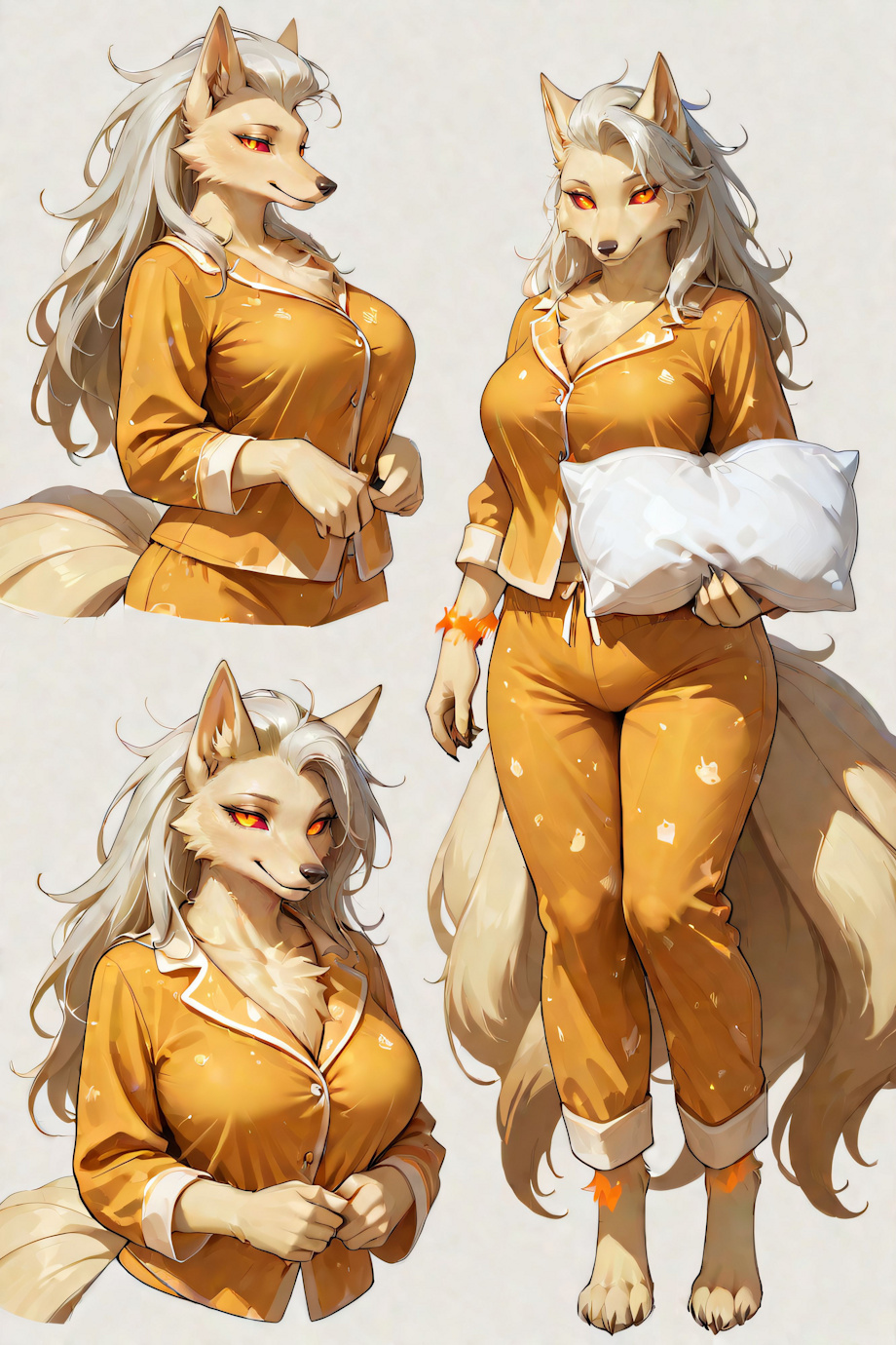 Blonde Fur, Chest Tuft, Digitigrade Legs, 9+ Prehensile Tails, Pointed Ears, Clawed Fingers, and Toe Claws.