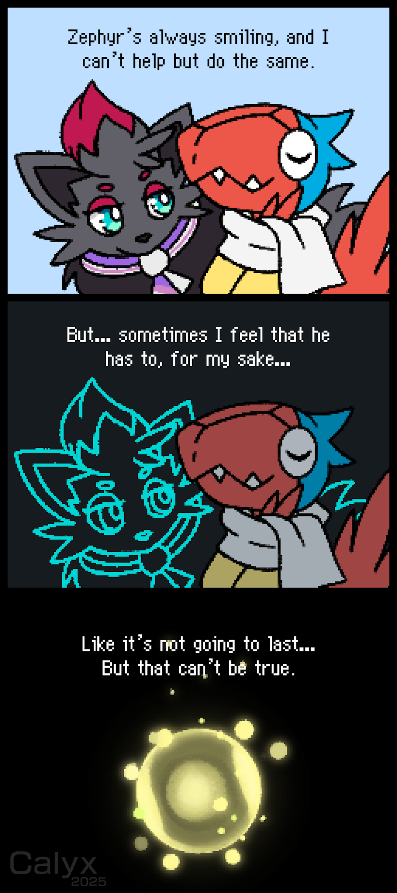 Want to see my art before they're uploaded here? See my Bluesky at calyxthefox . bsky. social !