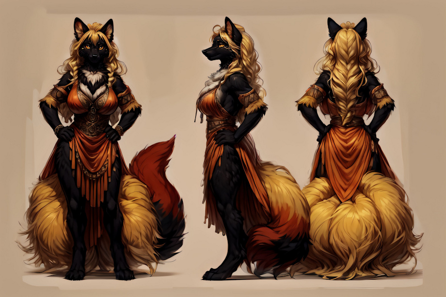 masterpiece, best quality <lora:(1) Furtastic Detailer:1> (solo:1.3) (pink tshirt, black slacks, full body:1.4) BREAK <l0tu5ty3> (male:1) (ninetales:1.4) (athletic body:1) (brown fur:1.5) (white chest fur, chest tuft:1.3) (short hair:1.3) (black hair, spiked hair:1.4) (red collar:1) (black sclera:1.3) (red eyes with black pupils:1.4) (strong thighs:1) (brown fuzzy wrists, brown fuzzy ankles:1.2) (digitigrade:1), fox ears (brown tails:1.5) (white spots:1.4) <lora:CharacterDesign_Concept:0.6> (CharacterSheet:1), (multiple views, full body, upper body, reference sheet:1),, (clothes:2) Negative prompt: bloodshot eyes, arms behind back, hands behind back, blurry, blurry background, bad anatomy, bad hands, three hands, three legs, bad arms, missing legs, missing arms, poorly drawn face, bad face, fused face, cloned face, worst face, three crus, extra crus, fused crus, worst feet, three feet, fused feet, fused thigh, three thigh, fused thigh, extra thigh, worst thigh, missing fingers, extra fingers, ugly fingers, long fingers, horn, realistic photo, extra eyes, huge eyes, 2girl, amputation, disconnected limbs, worst quality, normal quality, low quality, low res, blurry, text, watermark, logo, banner, extra digits, cropped, jpeg artifacts, signature, username, error, sketch ,duplicate, ugly, monochrome, horror, geometry, mutation, disgusting, jpeg artifacts, bad quality, jpg artifacts,badhandv4, easynegative boring_e621_v4, bad quality, worst quality, bloodshot eyes, 2 tails, black fur on forearms, black fur on legs, bell on ears,, bloodshot eyes, 2 tails,, (nipples, nude, nudity:2) (erect nipples:2) (topless:2) Steps: 35, Sampler: Euler a, CFG scale: 7, Seed: 1828675055, Size: 1152x768, Model hash: 8e2f4f1346, Model: yiffymix_v44, VAE hash: 24e650297c, VAE: furception_vae_1-0.safetensors, Denoising strength: 0.5, Mask blur: 4, CFG Rescale: 0.7, Lora hashes: "(1) Furtastic Detailer: 2e94914f676c, CharacterDesign_Concept: 6f65857a23ad", TI hashes: "badhandv4: 5e40d722fc3d, easynegative: c74b4e810b03, boring_e621_v4: f9b806505bc2", Version: v1.6.0 |