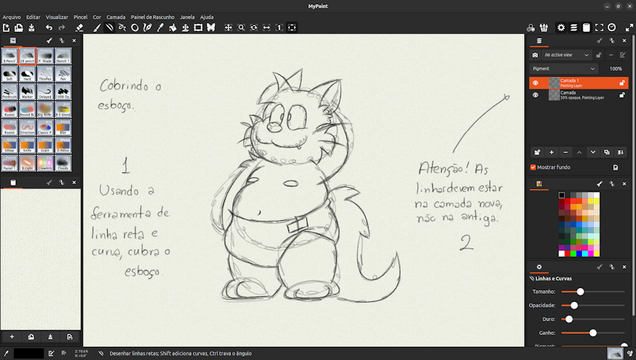 Click again on the + to create a new layer. That will be our color layer and must be under the line layer, so that the coloring does not erase the lines. Move, thence, the new layer to the second place in the list (drag and drop).