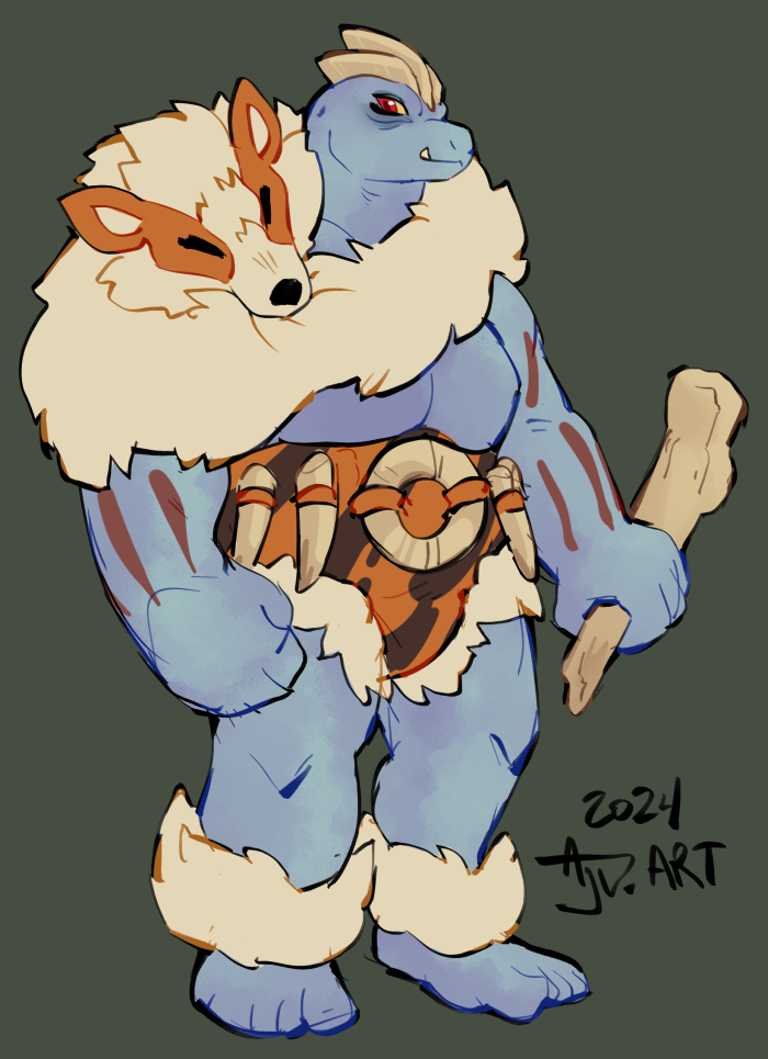 A caveman themed machoke design I wanted to try out for the pokemon design challenge I'm still working on. I got stuck at the machop line for a bit here but chipping away at it. This fella's name is Titan and he defeated a strong arcanine which he now wears as a trophy furs and bone. This adoptable has been sold.