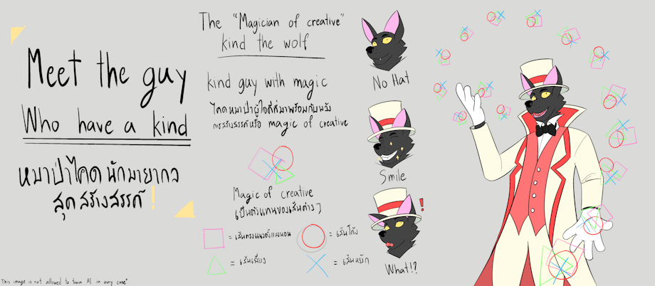 He is my oc. His name is kind the wolf, the creative magician