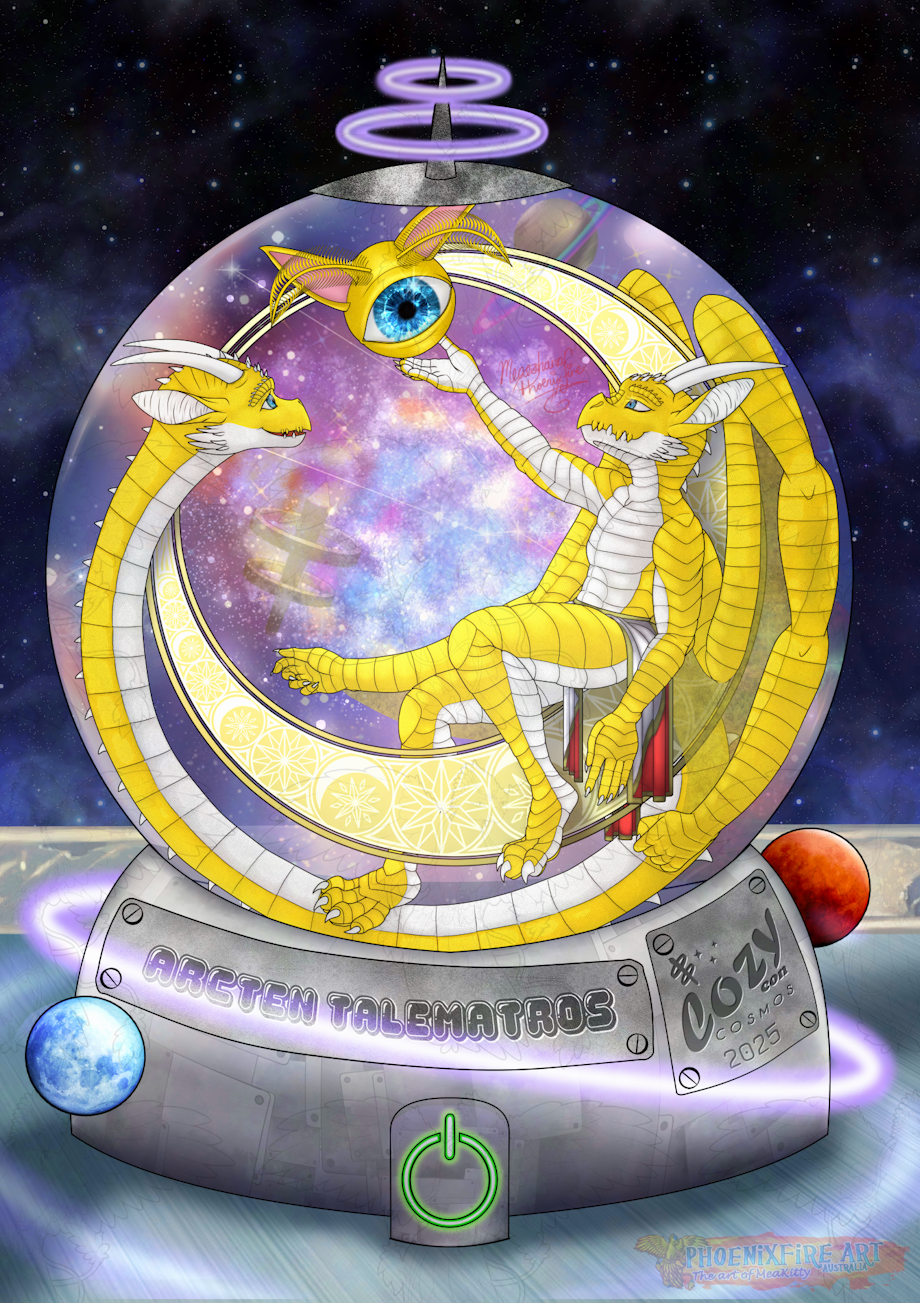 Cozy Con Online is a once a year VR get-together convention that you can attend from the comfort of your own home while wearing your pajamas. I created some YCH (Your Character Here) artwork for it. This one is Arcten Talematros - Owned by WDG.