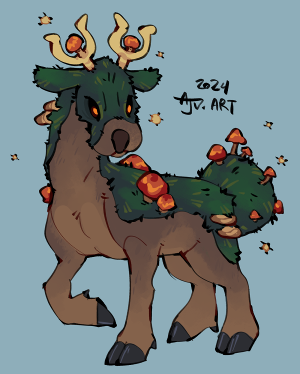 Overgrown stantler covered in moss and mushrooms. Instead of a hypnosis wave they seem to use pollen spores that are always floating around them.