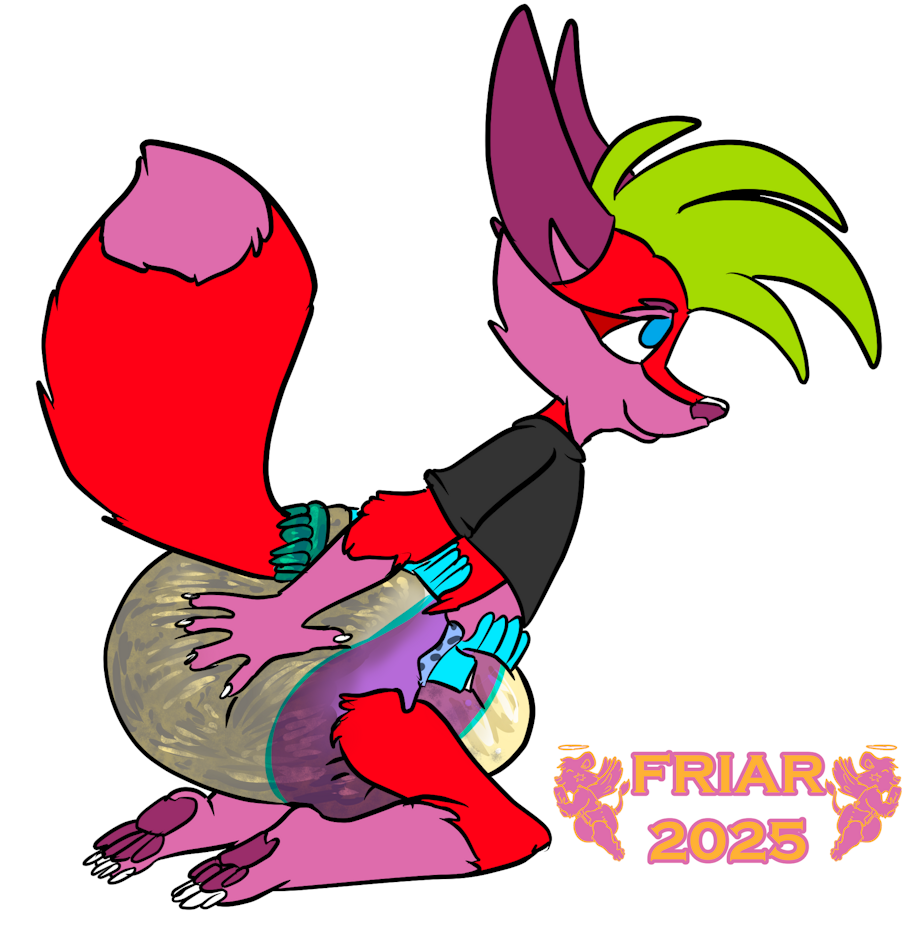 Illustration of Berry the wet and messy diapered fox kneeling on the floor next to his bed happily squishing his diaper.