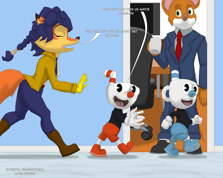 This series makes up the crossover fanart artworks featuring Carmelita Fox and the Cup brothers, all done for ZeyadWeAhmedRezk.