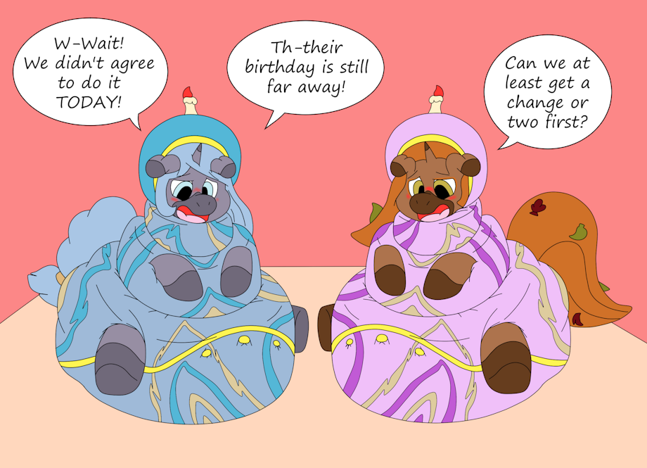 So fun story, this was originally supposed to go up in the lead up to my birthday at the beginning of the month... but then FA went into Reboot mode and is still up, so... well it's here today, maybe Luff and Wuff can get changes from their cakesies now, thanks to AgumonOfAlchemy for taking this idea on!