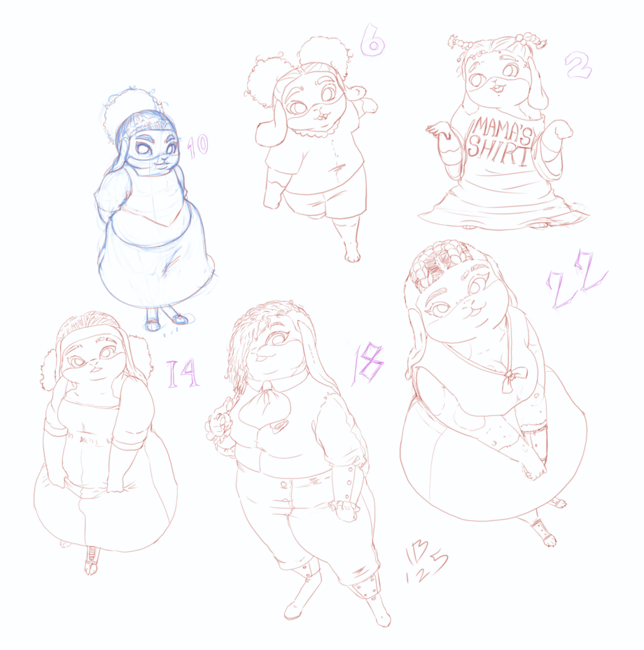 A few sketches of Pledge at different stages in her life. Her mother threw a fit when she started shaving her head during her senior year of high school. During most of her tween and teen years, Pledge was very quiet and reserved. She got the scar on her forehead from a dirt bike accident when she was 12.