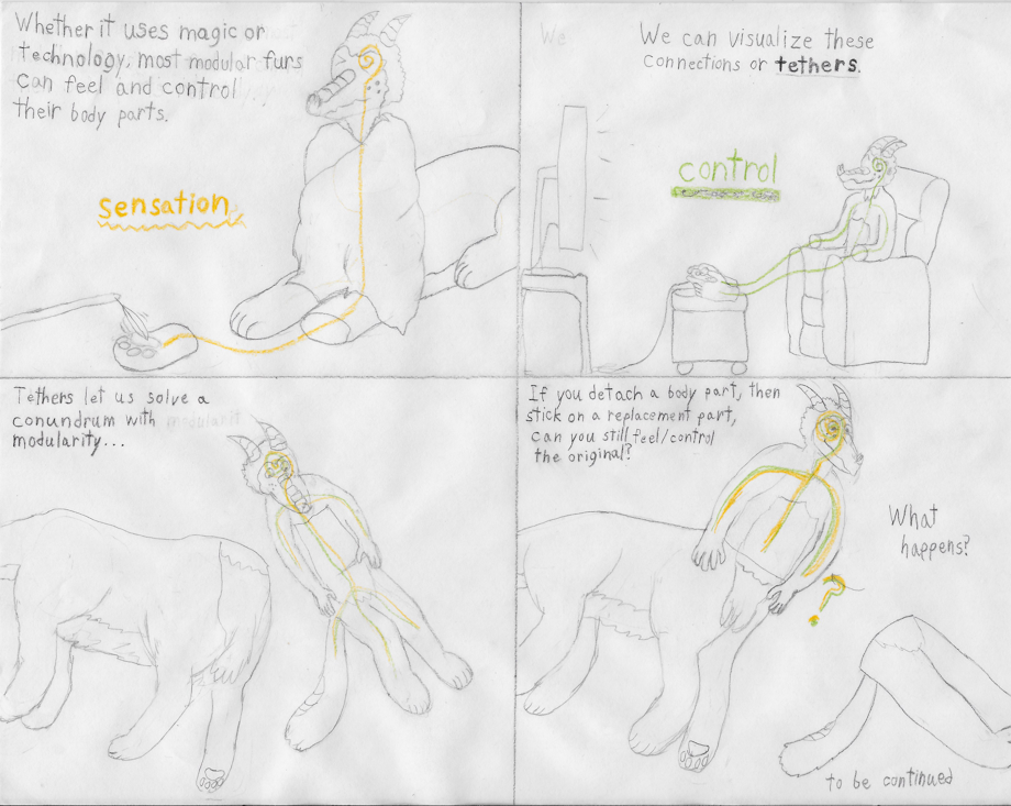 This brings me to the most interesting feature of this bone. When I look through it, I can see trails of light that connect Achaius' pieces when they are detached. If I focus, I can see the same faint trails in all people, but it seems to highlight what modular parts are remotely connected to one another. Like Achaius' magic, this thing behaves in an inconsistent but convenient way. When I think about which of Achaius' body parts are healthy inside his part chest, they seem to glow faintly red. Some of his friends have purple lines on their modular seams, but only when I think about them. So regardless of how this .. sight bone? Regardless of how this sight-bone works, it's going to let me study some interesting things about modular furs.