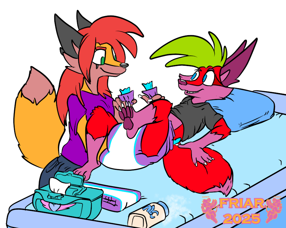 Illustration of Berry the wet and messy diapered fox getting his diaper changed by his mom Sun Pi on the changing table in his bedroom. Berry's booster seat gamer chair is visible in the background in front of his computer, as well as a turned over bottle of talc baby powder on the changing table, as well as wipes and a fresh diaper.