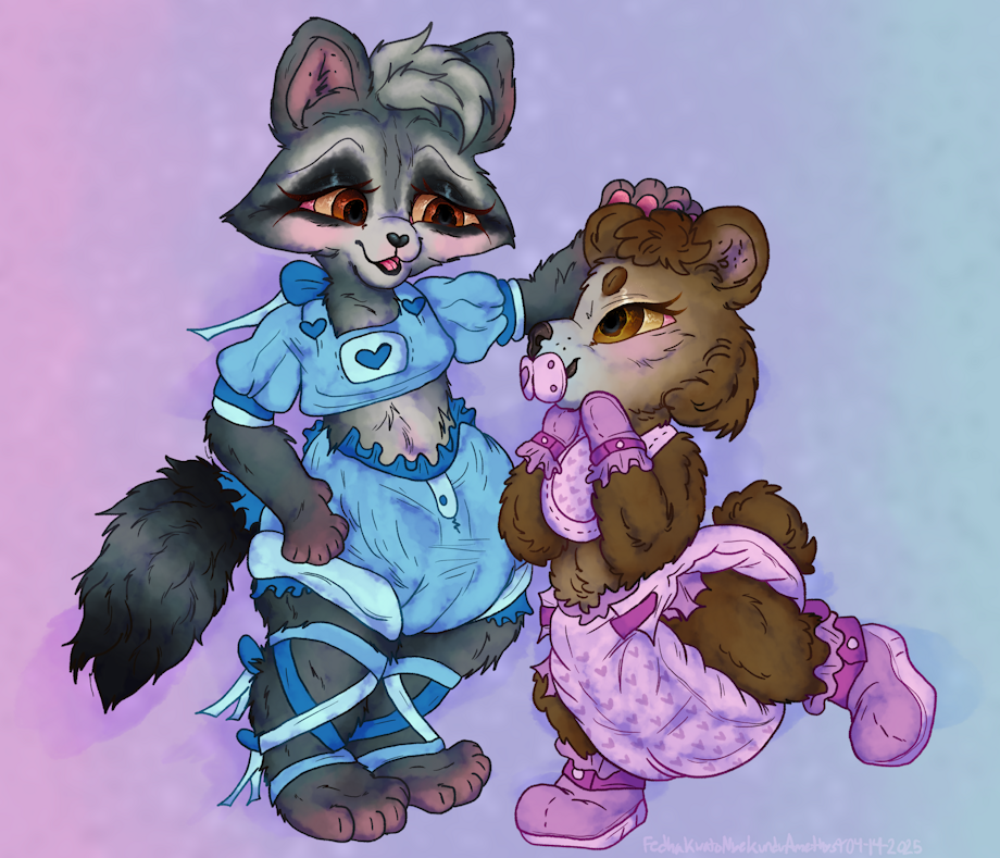 A gray and black baby raccoon wearing a blue shirt with bows and heart and matching shorts, a diaper underneath poking out, and ribbons along her legs with pink paws and a heart nose and deep reddish brown eyes, petting the head of a baby brown bear with light brown eyes, who has a pacifier, lilac coloured socks and boots, a heart print baby bib, and matching heart printed diaper on a lilac and baby blue background