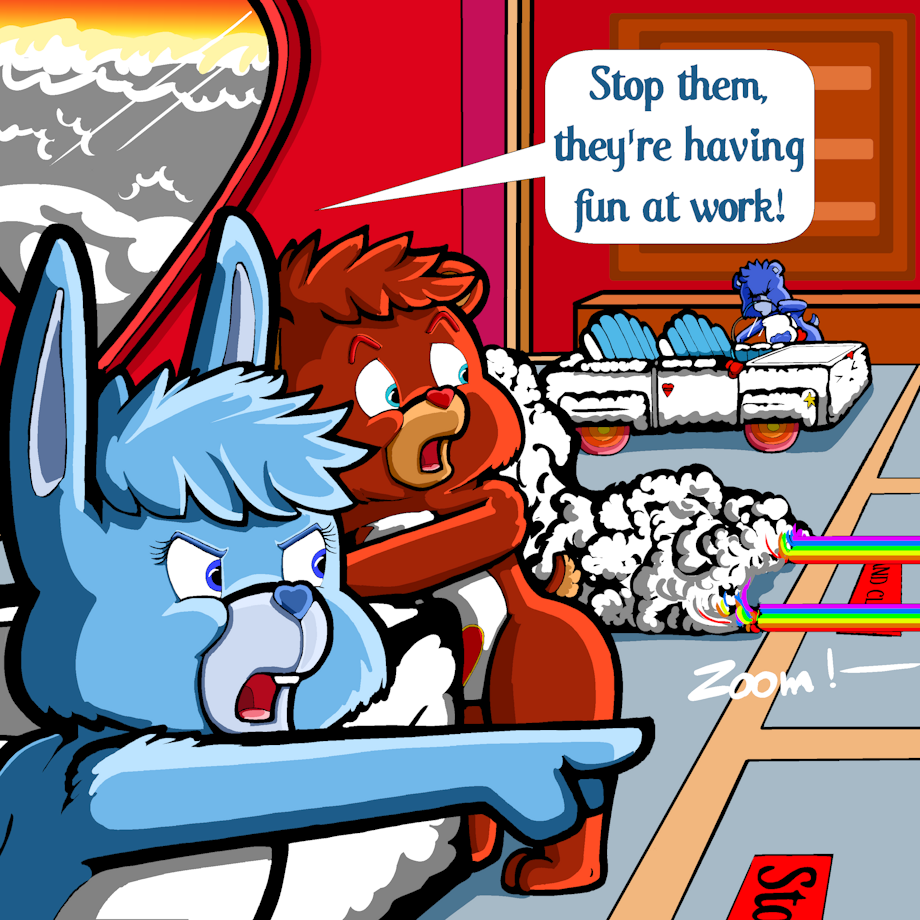 1: Tugs is so cute in all art you do (Hugs too) 2: Stop them, they're trying to have fun XD 3: That zoomed out shot of Care-A-Lot is amazing. I love how the Forest of Feelings and the Kingdom of Caring are split by the castle. Though I'm pretty sure to get to the FOF was by a boat trip over the sea in the clouds in the movie, but eh.