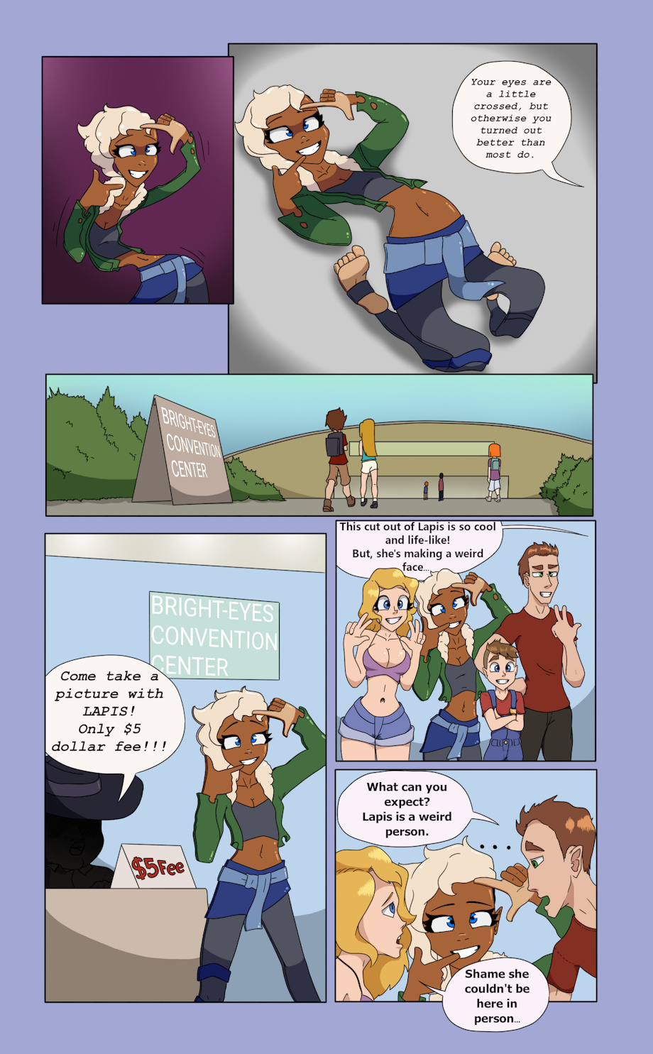 Once Lapis had been flattened, her body was glued to a cut-out piece of display-board and laminated to ensure she kept her shape. Her finished display was put into storage until the day of the meet-up. Because Lapis was unable to transport herself to the convention center, the studio was nice enough to deliver her themselves. Lapis was also unable to pay for their services, so the employees established a system where fans could pay a fee to take a picture with the display.