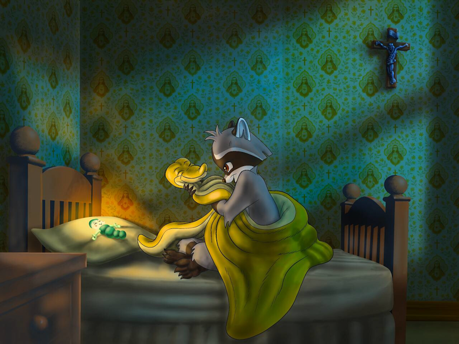 Here we see Bri the Raccoon and his imaginary friend made from his blanket. This was inspired by my memory of making whatever blanket I had on hand into an imaginary friend that would keep me company and keep me cuddled and protected.