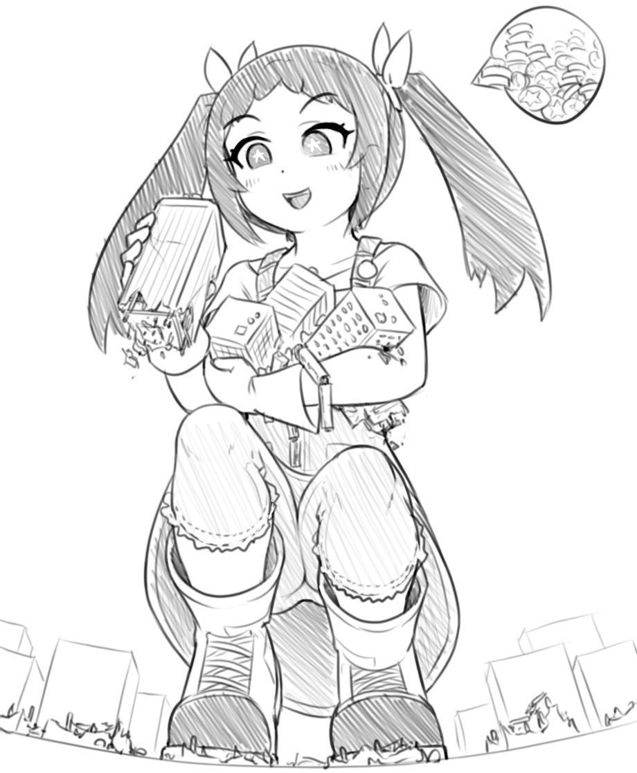 Businessminded girls a cute, especially when they can make all sorts of absurd moves like this due to how big they are! Sjal's design is nice, I like her overalls and sneakerboots. This was a good idea so I'm happy you redrew it! She looks even cuter now! Fun starry eyes hahaha.