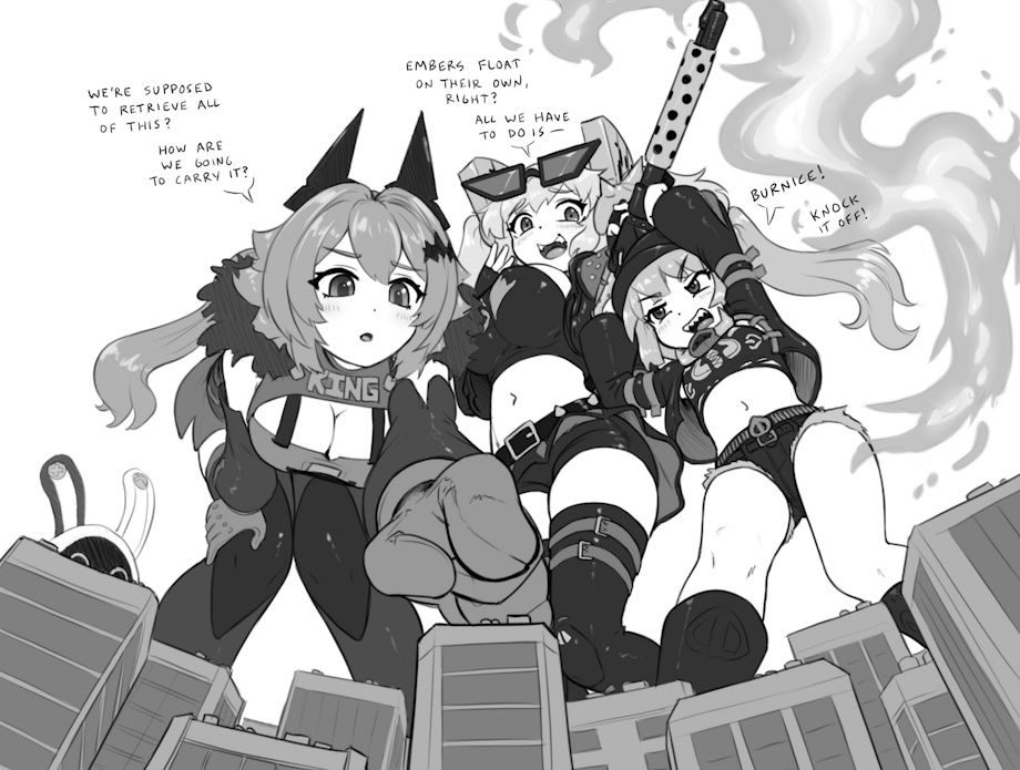 Impressive triple POV! Especially given the hour! I like the glovefinger perspective a lot, it's a great idea! Even her fingertip is as big as a skyscraper's rooftop! The other two interacting in the back's fun, don't let her go too wild with those flames now! Also, quality tummies. Nice work on finishing this up! The grayscaling looks great for their outfits. Those flames are rendered in a neat way too!