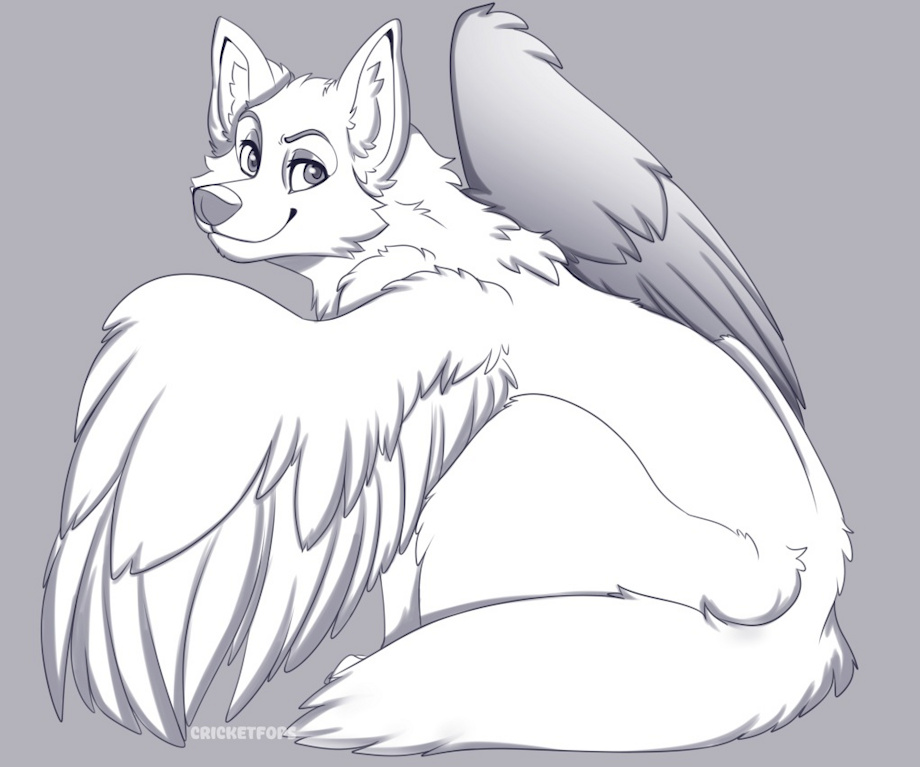 This is another absolutely wonderful drawing of my winged wolf OC Beowulf drawn by my friend Triker, this time just in his normal, feral form. This is probably my new favorite drawing of Beowulf, and If you want to see more of their art, as well as the rare bit of gaming, you can find them on Twitch at https://www.twitch.tv/trikersaurus. I highly recommend it, they're really fun to watch, and it's always a good time, or you can follow them on BlueSky at https://bsky.app/profile/trikersaurus.bsky.social if that's more your speed