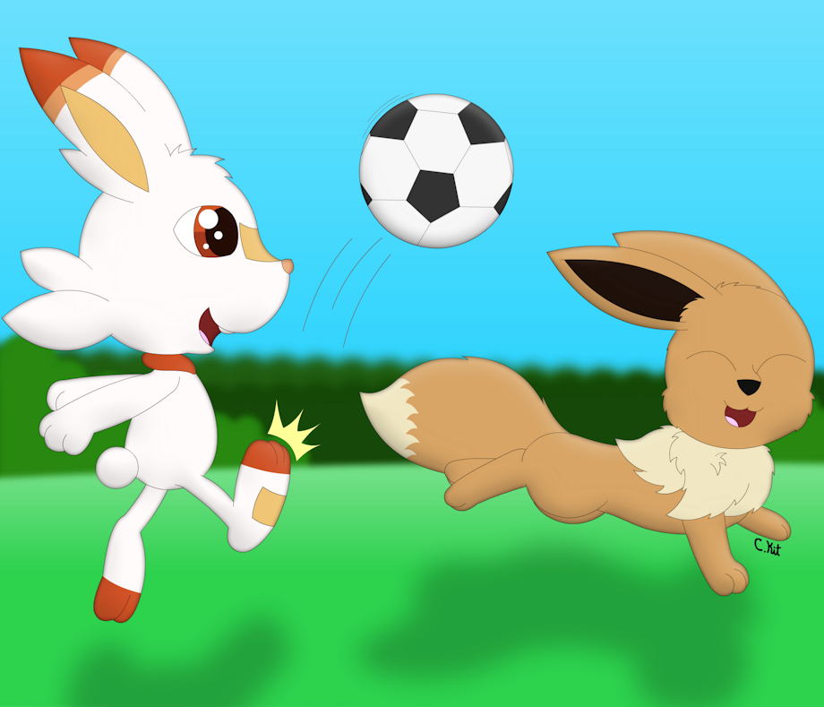 Eevee and Scorbunny are having fun playing with a ball outside on this lovely spring weather! ^.^