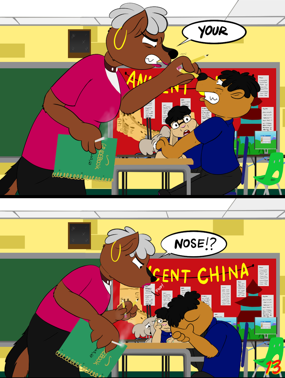 While Ms. Tiggs walks to the back of the class, she notices Willie putting pencils up his nose to get Mike's attention. Ms. Tiggs then snatches the pencils out of his nose.
