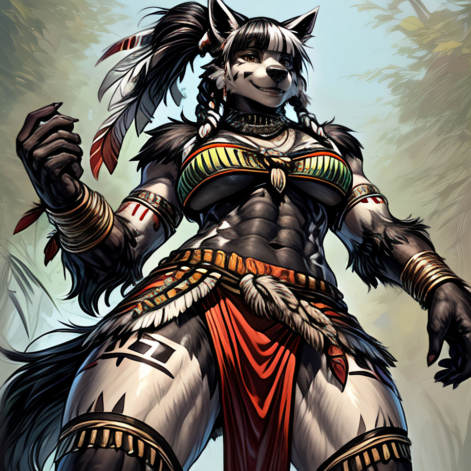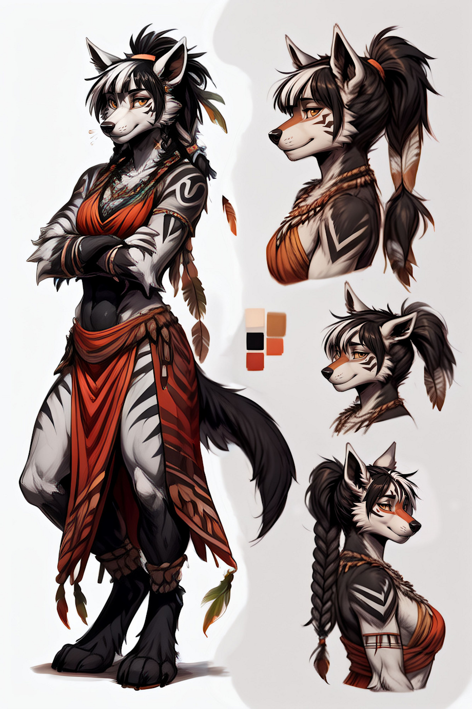 masterpiece, best quality, <lora:(1) Furtastic Detailer:1> (tribal robes:1.4) BREAK <sm0k3> ( AS-Adult:1.4) A (mightyena:1.4) (female:1.4) with (white furry forearms:1.3) and She has (short black hair:1.3) (ponytail, braided, white highlights:1.4) (bangs:side:1.5) (black fur:1.2), and wears a (medium breasts:1.4) (white tribal markings:1.5) (digitigrade:1.2) legs, and (black belly:1.4) (athletic:1.5) (thick legs, thick arms:1.5), <lora:CharacterDesign_Concept:0.6> (CharacterSheet:1), (multiple views, full body, upper body, reference sheet:1), Negative prompt: bloodshot eyes, arms behind back, hands behind back, blurry, blurry background, bad anatomy, bad hands, three hands, three legs, bad arms, missing legs, missing arms, poorly drawn face, bad face, fused face, cloned face, worst face, three crus, extra crus, fused crus, worst feet, three feet, fused feet, fused thigh, three thigh, fused thigh, extra thigh, worst thigh, missing fingers, extra fingers, ugly fingers, long fingers, horn, realistic photo, extra eyes, huge eyes, 2girl, amputation, disconnected limbs, worst quality, normal quality, low quality, low res, blurry, text, watermark, logo, banner, extra digits, cropped, jpeg artifacts, signature, username, error, sketch ,duplicate, ugly, monochrome, horror, geometry, mutation, disgusting, jpeg artifacts, bad quality, jpg artifacts,badhandv4, easynegative boring_e621_v4, boring_e621_v4, bad quality, worst quality, Steps: 35, Sampler: Euler a, CFG scale: 7.5, Seed: 807630693, Size: 768x1152, Model hash: 8e2f4f1346, Model: yiffymix_v44, VAE hash: 24e650297c, VAE: furception_vae_1-0.safetensors, Denoising strength: 0.54, Mask blur: 4, CFG Rescale: 0.7, Lora hashes: "(1) Furtastic Detailer: 2e94914f676c, CharacterDesign_Concept: 6f65857a23ad", Version: v1.6.0 |
