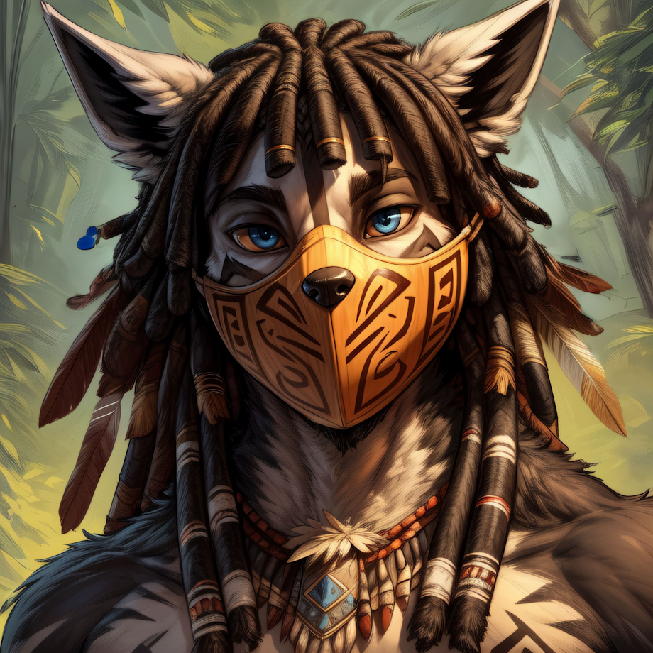 masterpiece, best quality, <lora:(1) Furtastic Detailer:1> (tribal outfit:1.4) BREAK <p1k3> (male:1.3) A (mightyena:1.4) with (black furry forearms:1.3) and he has (brown hair:1.3) (flat bangs:1.5) , (grayfur:1.2), and (blue eyes with black pupils:1.4) (dreadlocks:1.4) (slender:1.4) (black tribal markings:1.5) (digitigrade:1.2) legs, and (white belly:1.4) (muscular legs:1.5) <lora:CharacterDesign_Concept:0.6> (CharacterSheet:1), (multiple views, full body, upper body, reference sheet:1), Negative prompt: bloodshot eyes, arms behind back, hands behind back, blurry, blurry background, bad anatomy, bad hands, three hands, three legs, bad arms, missing legs, missing arms, poorly drawn face, bad face, fused face, cloned face, worst face, three crus, extra crus, fused crus, worst feet, three feet, fused feet, fused thigh, three thigh, fused thigh, extra thigh, worst thigh, missing fingers, extra fingers, ugly fingers, long fingers, horn, realistic photo, extra eyes, huge eyes, 2girl, amputation, disconnected limbs, worst quality, normal quality, low quality, low res, blurry, text, watermark, logo, banner, extra digits, cropped, jpeg artifacts, signature, username, error, sketch ,duplicate, ugly, monochrome, horror, geometry, mutation, disgusting, jpeg artifacts, bad quality, jpg artifacts,badhandv4, easynegative boring_e621_v4, boring_e621_v4, bad quality, worst quality, Steps: 1, Sampler: Euler, CFG scale: 7.5, Seed: 1243770685, Size: 128x128, Model hash: 8e2f4f1346, Model: yiffymix_v44, VAE hash: 24e650297c, VAE: furception_vae_1-0.safetensors, Denoising strength: 0.47, CFG Rescale: 0.7, ADetailer model: person_yolov8s-seg.pt, ADetailer confidence: 0.3, ADetailer dilate erode: 4, ADetailer mask blur: 4, ADetailer denoising strength: 0.4, ADetailer inpaint only masked: True, ADetailer inpaint padding: 32, ADetailer model 2nd: face_yolov8s.pt, ADetailer confidence 2nd: 0.3, ADetailer dilate erode 2nd: 4, ADetailer mask blur 2nd: 4, ADetailer denoising strength 2nd: 0.4, ADetailer inpaint only masked 2nd: True, ADetailer inpaint padding 2nd: 32, ADetailer version: 24.11.1, Lora hashes: "(1) Furtastic Detailer: 2e94914f676c, CharacterDesign_Concept: 6f65857a23ad", TI hashes: "badhandv4: 5e40d722fc3d, easynegative: c74b4e810b03, boring_e621_v4: f9b806505bc2", Version: v1.6.0 |