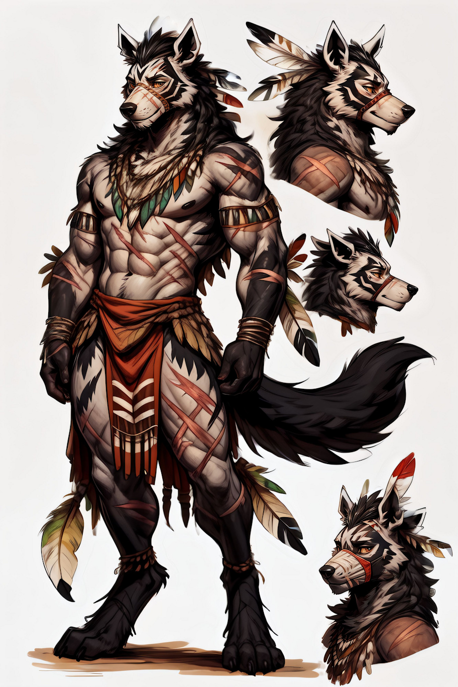 masterpiece, best quality, <lora:(1) Furtastic Detailer:1> (tribal outfit:1.4) BREAK <ch1m4ll1> A (male:1.4) (mightyena:1.4) (black fur:1.4) (white stripes:1.4) (muscles:1.3) (digitigrade:1.3) (scars:1.5) (muscular:1.4) (feather headress:1.4) (thick legs:1.3) (black markings:1.3) (tribal markings:1.3) (wooden mask:1.4) <lora:CharacterDesign_Concept:0.6> (CharacterSheet:1), (multiple views, full body, upper body, reference sheet:1), Negative prompt: bloodshot eyes, arms behind back, hands behind back, blurry, blurry background, bad anatomy, bad hands, three hands, three legs, bad arms, missing legs, missing arms, poorly drawn face, bad face, fused face, cloned face, worst face, three crus, extra crus, fused crus, worst feet, three feet, fused feet, fused thigh, three thigh, fused thigh, extra thigh, worst thigh, missing fingers, extra fingers, ugly fingers, long fingers, horn, realistic photo, extra eyes, huge eyes, 2girl, amputation, disconnected limbs, worst quality, normal quality, low quality, low res, blurry, text, watermark, logo, banner, extra digits, cropped, jpeg artifacts, signature, username, error, sketch ,duplicate, ugly, monochrome, horror, geometry, mutation, disgusting, jpeg artifacts, bad quality, jpg artifacts,badhandv4, easynegative boring_e621_v4, boring_e621_v4, bad quality, worst quality, Steps: 35, Sampler: Euler a, CFG scale: 7.5, Seed: 1021192695, Size: 768x1152, Model hash: 8e2f4f1346, Model: yiffymix_v44, VAE hash: 24e650297c, VAE: furception_vae_1-0.safetensors, Denoising strength: 0.47, Mask blur: 4, CFG Rescale: 0.7, Lora hashes: "(1) Furtastic Detailer: 2e94914f676c, CharacterDesign_Concept: 6f65857a23ad", TI hashes: "badhandv4: 5e40d722fc3d, easynegative: c74b4e810b03, boring_e621_v4: f9b806505bc2", Version: v1.6.0 |
