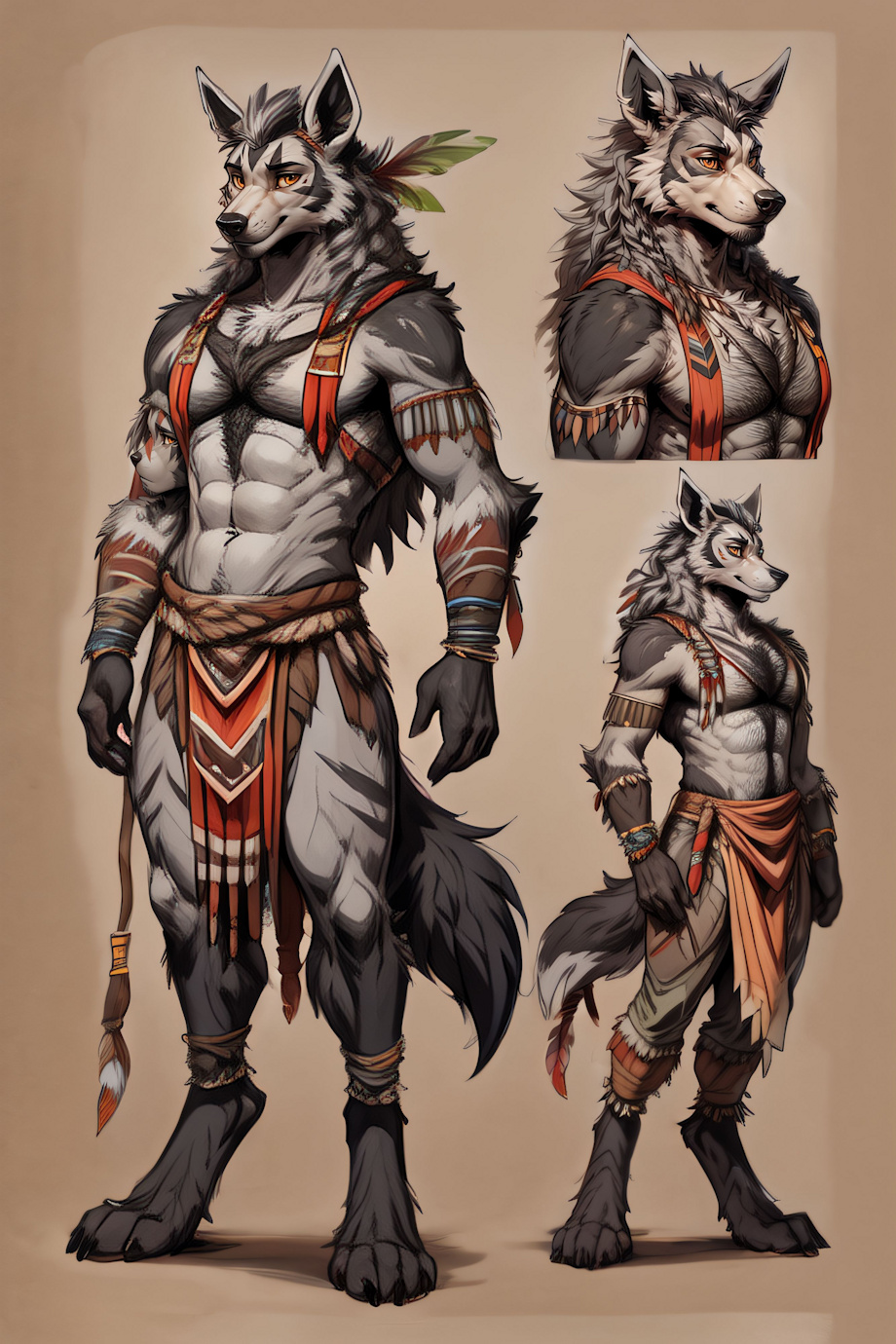 Gray and Black Fur, Pointed Ears, Black Nose, Muscular Build, Digitigrade Legs, Clawed Fingers, Toe Claws, and Chest Tuft.