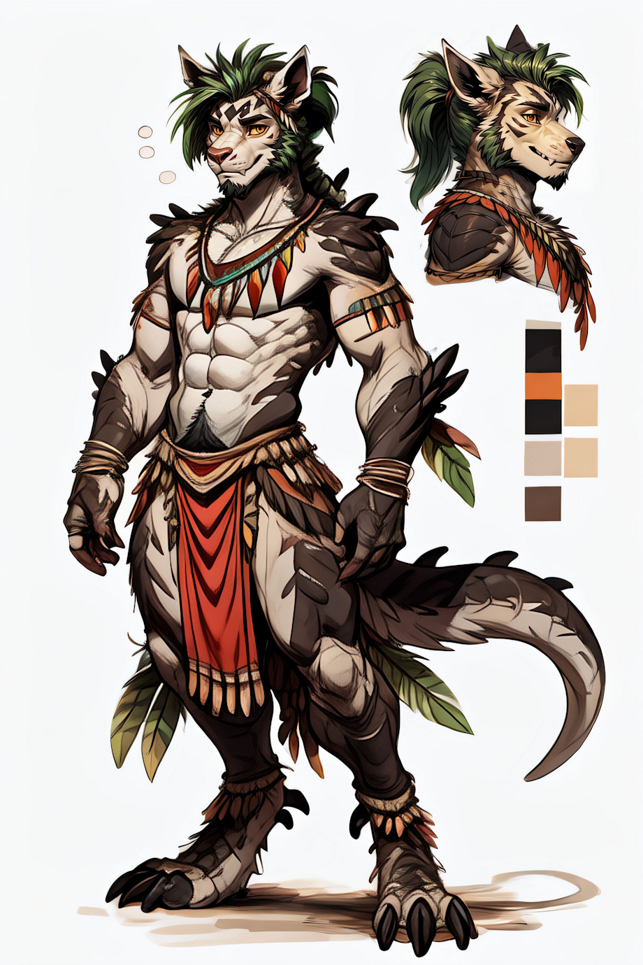 masterpiece, best quality, <lora:(1) Furtastic Detailer:1> (solo, tribal outfit:1.4) BREAK <h41t> <lora:Deathclaw_v2:0.3> deathclaw BREAK A (mightyena:1.3) (chesnaught:0.5) (male:1.2) with (white scales:1.5) (scuted forearms:1.3) and a (black circle fur outline on forehead:1.3). He has (ponytail:1.3) (green hair:1.3) (short hair:1.3), (muscular:1.4) (gray fur:1.3), (orange eyes with black pupils:1.2), and (digitigrade:1.2) legs, and (gray belly:1.4) (shoulder spikes:1.3) (exoskeleton:1.4) (large arms:1.3) (sideburns:1.3) (short tail:1.4) (dog ears:1.3) <lora:CharacterDesign_Concept:0.6> (CharacterSheet:1), (multiple views, full body, upper body, reference sheet:1),, (clothes:2) Negative prompt: bloodshot eyes, arms behind back, hands behind back, blurry, blurry background, bad anatomy, bad hands, three hands, three legs, bad arms, missing legs, missing arms, poorly drawn face, bad face, fused face, cloned face, worst face, three crus, extra crus, fused crus, worst feet, three feet, fused feet, fused thigh, three thigh, fused thigh, extra thigh, worst thigh, missing fingers, extra fingers, ugly fingers, long fingers, horn, realistic photo, extra eyes, huge eyes, 2girl, amputation, disconnected limbs, worst quality, normal quality, low quality, low res, blurry, text, watermark, logo, banner, extra digits, cropped, jpeg artifacts, signature, username, error, sketch ,duplicate, ugly, monochrome, horror, geometry, mutation, disgusting, jpeg artifacts, bad quality, jpg artifacts,badhandv4, easynegative boring_e621_v4, boring_e621_v4, bad quality, worst quality,, (nipples, nude, nudity:2) (erect nipples:2) (topless:2) Steps: 35, Sampler: Euler a, CFG scale: 7.5, Seed: 1792041750, Size: 512x768, Model hash: 8e2f4f1346, Model: yiffymix_v44, VAE hash: 24e650297c, VAE: furception_vae_1-0.safetensors, Denoising strength: 0.01, CFG Rescale: 0.7, ADetailer model: person_yolov8s-seg.pt, ADetailer confidence: 0.3, ADetailer dilate erode: 4, ADetailer mask blur: 4, ADetailer denoising strength: 0.4, ADetailer inpaint only masked: True, ADetailer inpaint padding: 32, ADetailer model 2nd: face_yolov8s.pt, ADetailer confidence 2nd: 0.3, ADetailer dilate erode 2nd: 4, ADetailer mask blur 2nd: 4, ADetailer denoising strength 2nd: 0.4, ADetailer inpaint only masked 2nd: True, ADetailer inpaint padding 2nd: 32, ADetailer version: 24.11.1, Hires upscale: 1.5, Hires steps: 20, Hires upscaler: 4xUltrasharp_4xUltrasharpV10.pth, Lora hashes: "(1) Furtastic Detailer: 2e94914f676c, Deathclaw_v2: 0342a4e0db5a, CharacterDesign_Concept: 6f65857a23ad", Version: v1.6.0 |