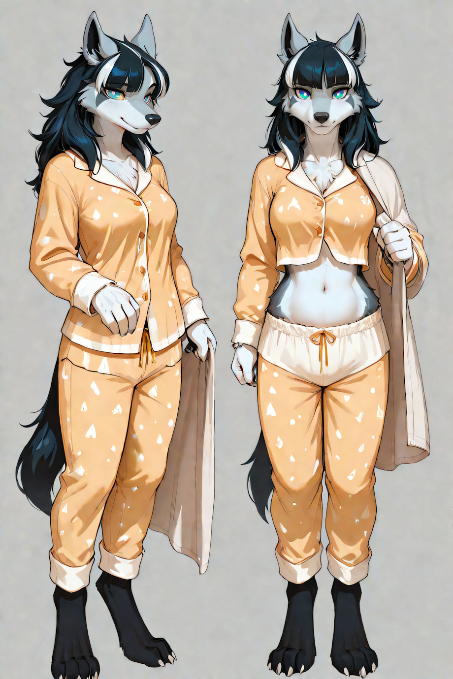 Body: White Fur, Black Extremities, Bushy Tail, Pointed Ears, Clawed Fingers, Toe Claws, Black Nose, Digitigrade Legs, Slender, and Chest Tuft.