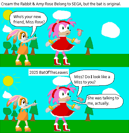 Page 1 is a crosspost of https://www.furaffinity.net/view/60956476/ and the main thing I intend to post here. To copy most of what I wrote on FA, This is a fanart mostly made yesterday, but I made a fix to tonight after realizing I made a typo with where I put a comma. Okay, I started this art of Amy on October 24 of last year, made some edits on May 10th, and finished Amy as well as drew Cream, Rose (the fruit bat) and the background yesterday. Then again, the whole joke here is the bat character happens to be named Rose. I guess it only works if Cream is being particularly formal and calling Amy by her last name. Seems the last art of Rose I drew was from last year. This animated GIF https://inkbunny.net/s/3437683