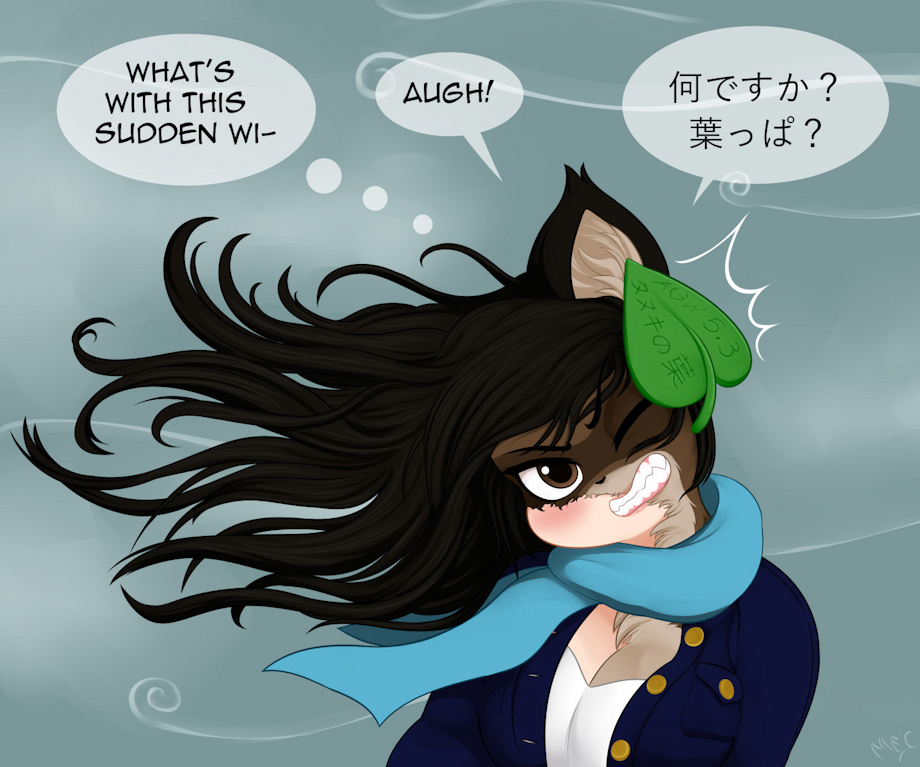 got slapped by a leaf being carried by the wind, wait, what is she saying? Wait, what's written on that leaf?