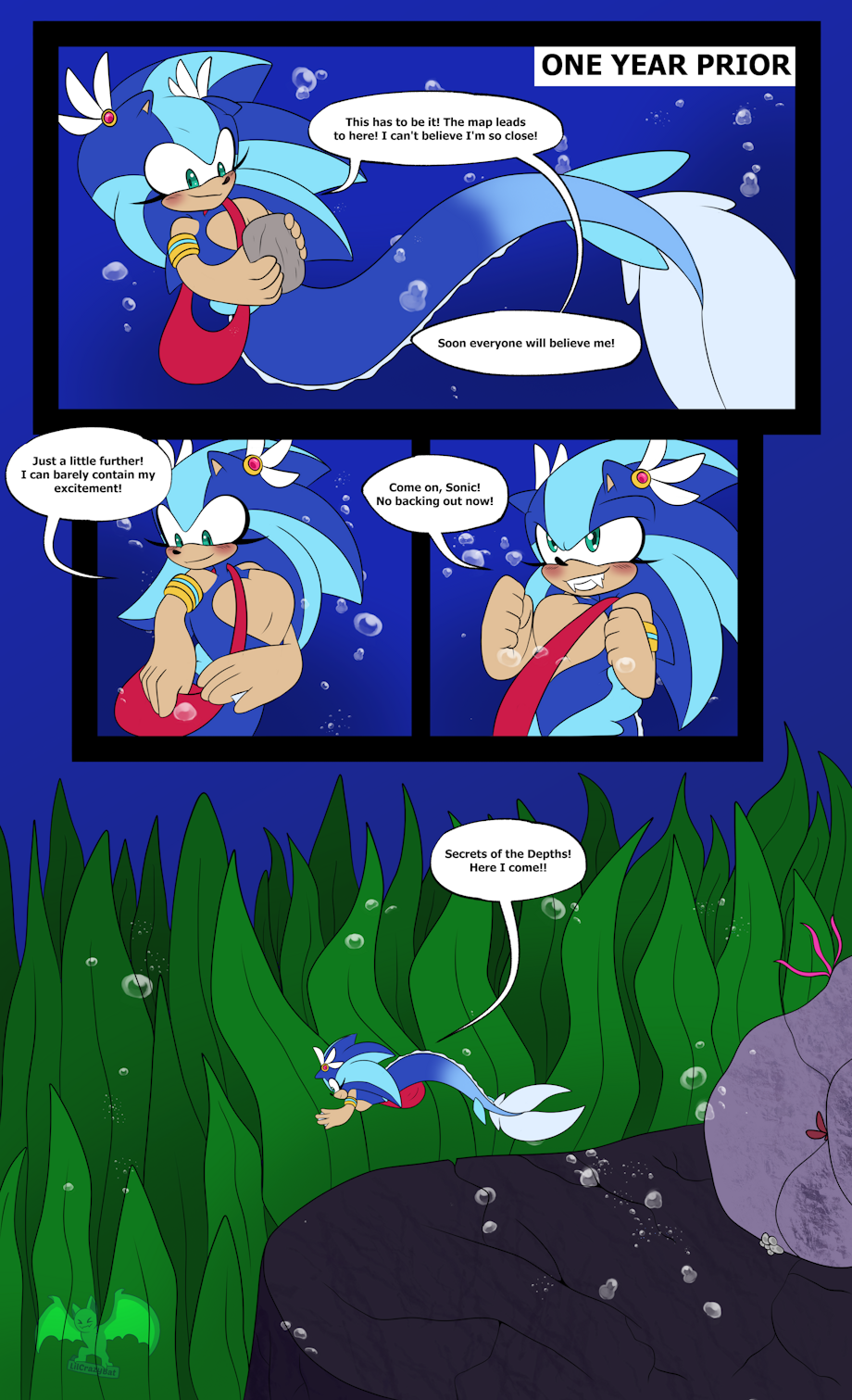 Sonic's journey to find the secrets of the Leviantan continues! Hopefully his studies haven't failed him. It feels like he's been swimming forever. What an unfortunate time to get lost, now he has a problem. Seems a barracuda has found him.. Alone in dangerous waters..