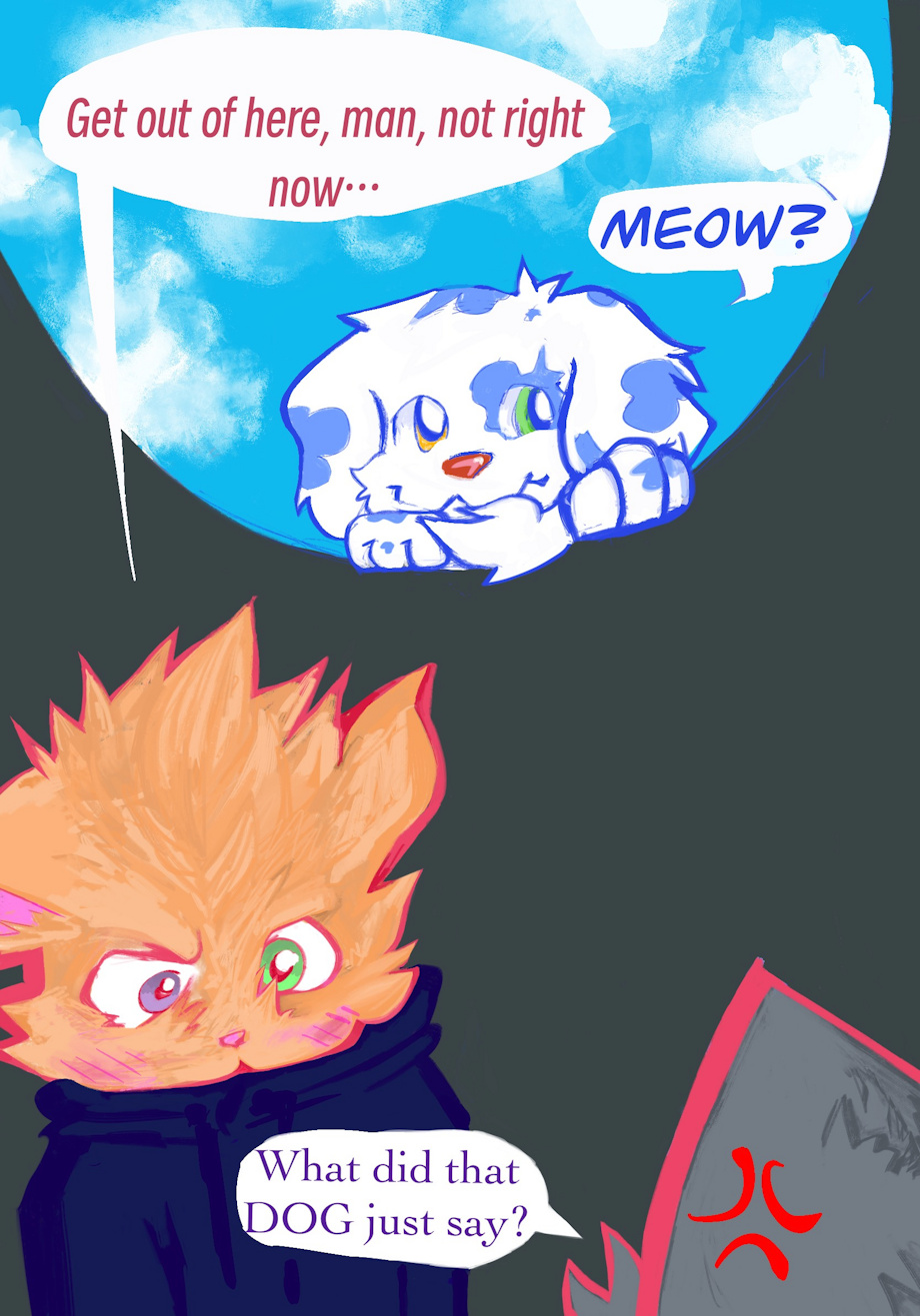 these are my OCs - Still no names for them - the backstory is the ginger cat is in a CATS ONLY anti dog club... but his ("masc-presenting" ok) gf is a dog and they're in love they met on a dog hate website actually