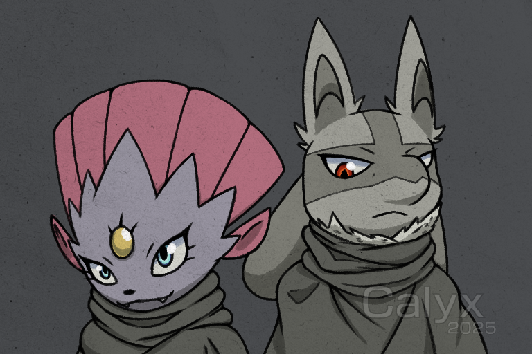 Couldn't help but do a drawing of the main two leads, I really love them and their personalities! --- Want to see my art before they're uploaded here? See my Bluesky at calyxthefox . bsky. social !