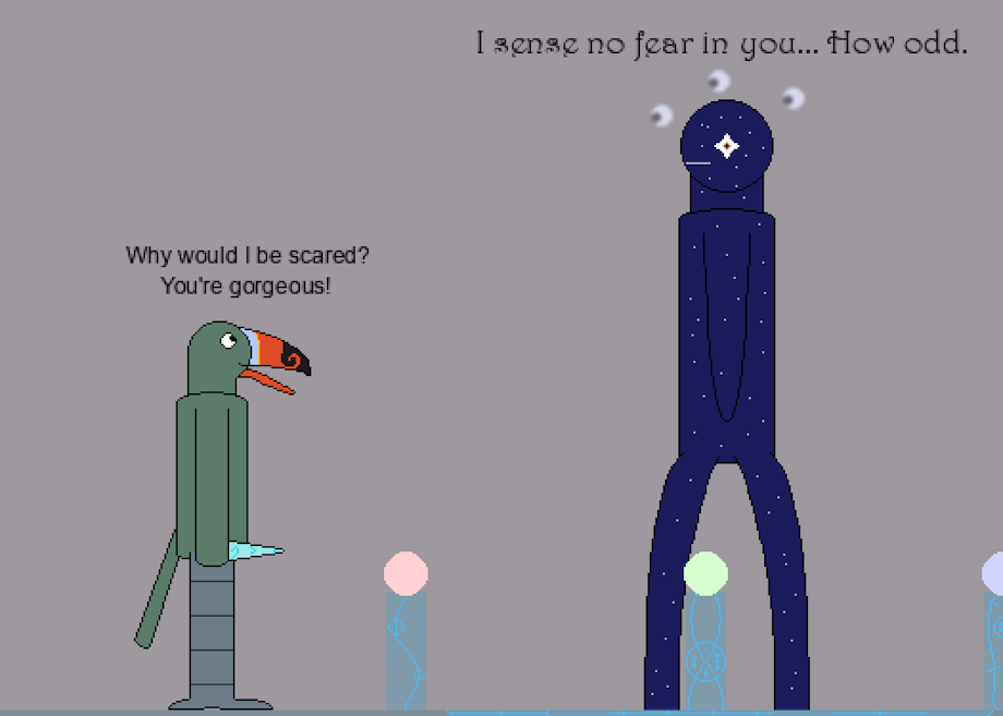 L: Toucan: "No worries, I'll keep that between us. Who would've thought that gods would sometimes sort of weaken themselves like that... Have either of you guys ever done a breath holding contest?"