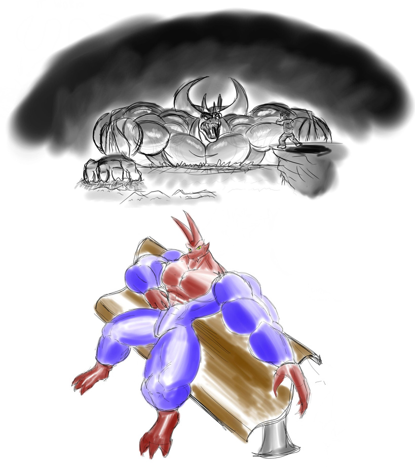 So we bought a bigger canvas and started being bad boys. He made a huge sexy macro dragon with huge muscles and a huge bread, and I made my sweet demon 'Oldpal', good for practicing new styles. There was buff.