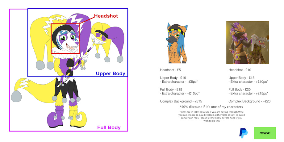 =Flat color= Headshot - £5 Upper Body - £10 - Extra character - +£5pc* Full Body - £15 - Extra character - +£10pc* Complex Background - +£15