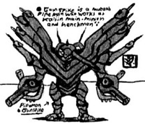 This is a SHADOW Machine-Beastman Pipemen that had been made but with slight mutations, manly that he's slightly smarter the the normal Pipeman-units, his hands are stuck in gun-form and he has a spike instead of an eye, so he was given the nickname "Gunspike" 銃スパイク, Lord Destruction gave this unit to Kaizu as his personal henchmen.