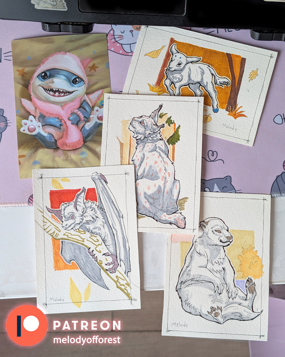 Postcards I drew for my supporters on Boosty and sent by letter.