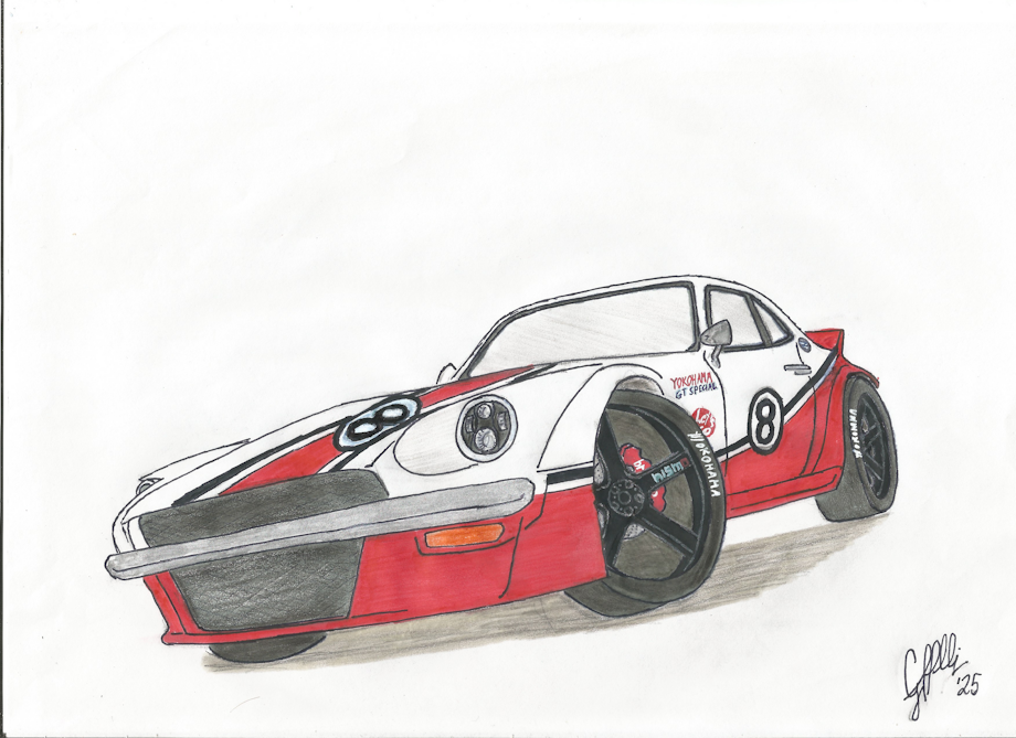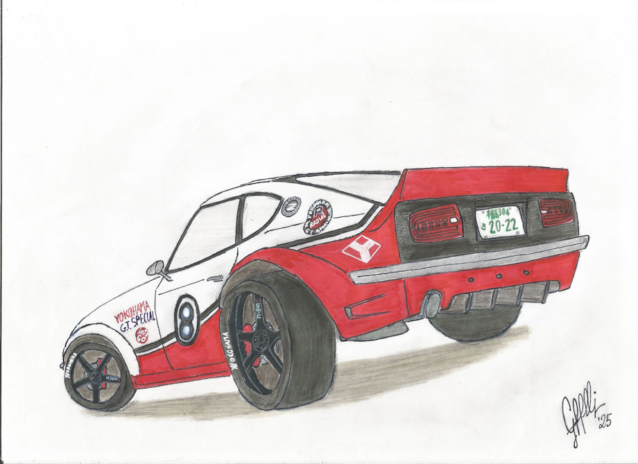 This car belongs to my character Dakota Kenji Akira Takamoto-Joestar, the description is the following: an Off-White 1976 Datsun 280Z Restomod (with the Front & Rear Bumper from a 1972 Datsun 240Z & has the Yokohama GT Special Livery with the Number 8 on the Doors & Hood, Custom Side-View Mirrors on the Doors, LED Headlights & Tail-Lights, a Borla Exhaust, Brembo Brakes, Custom-Made Nismo Inspired Parts (Gauge Cluster, Digital Gauge Pods, Tachometer with Shift Light, Nismo Steering Wheel & Recaro Bucket Seats), Parts from both a 1970 Nissan Fairlady Z432 & Z432R, powered by the RB26DETT Z2 Engine from a Nissan Skyline GTR R34 Z-Tune with a 6-Speed Manual Transmission, Nismo LMGT4 Rims & Yokohama Tires).
