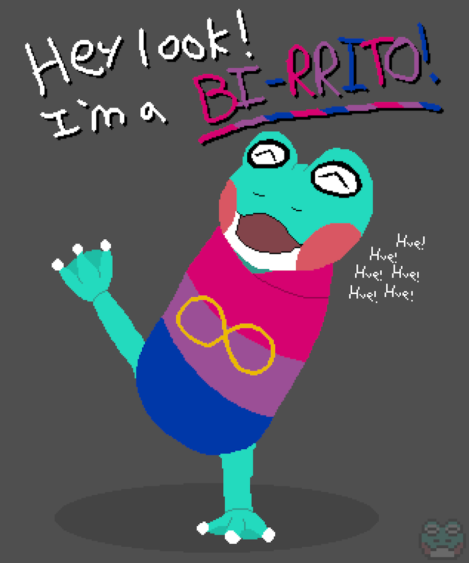Been sitting on the "Birrito" pun for the better part of a year and I'm VERY pleased to finally put it down to pixel! And as an added bonus, I added the Autism Pride symbol to my little bi flag wrap! (Least I really REALLY hope this is the right one. My brief research says it is, and you'd think being an autistic on the internet I'd be more up to date with these things but nope! I very much live under a metaphorical rock, so for the love of pete lemme know if I screwed something up here!)