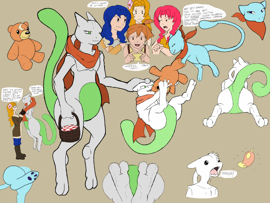 did a doodle sheet of a Mew/Mewtwo family ft Misty and her sisters