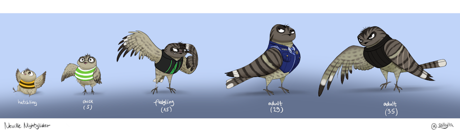 I had the idea that the fledgling phase of the birds could be the bird equivalent for the puberty, that’s why I gave teenage Neville a lanky, bit awkward-looking body and uneven plumage which he used to feel really embarrassed about.😅