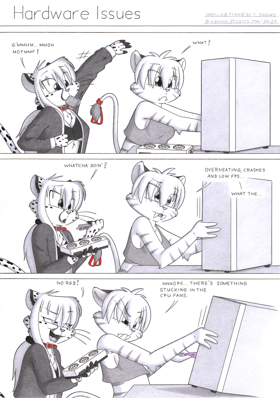 This is from my comic series "Tira vs. Vanillas" the third part and this time it's about computer hardware and... wait for page two :D This comic has two pages but a bonus page (alternative ending). You can choose what ending I should uploading first. The good or the bad ending :)
