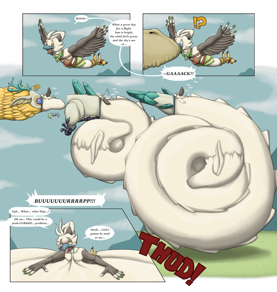 All he looked forward to was a nice clear flight across Hyrule's skies but didn't expect to have a mouthful of the land's longest pasta noodle. Tulin landed with a thud with a stomach full of dragon. Hopefully Link won't be too mad at him.
