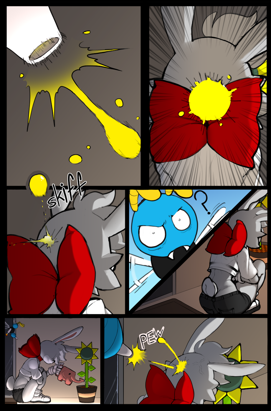 oop i forgot to comment on this when i first saw it >.< the middle panel flip sequence fucking kills me lmao. so good. the expressions here are all just perfect. i've really been loving this whole comic, keep up the great work <3