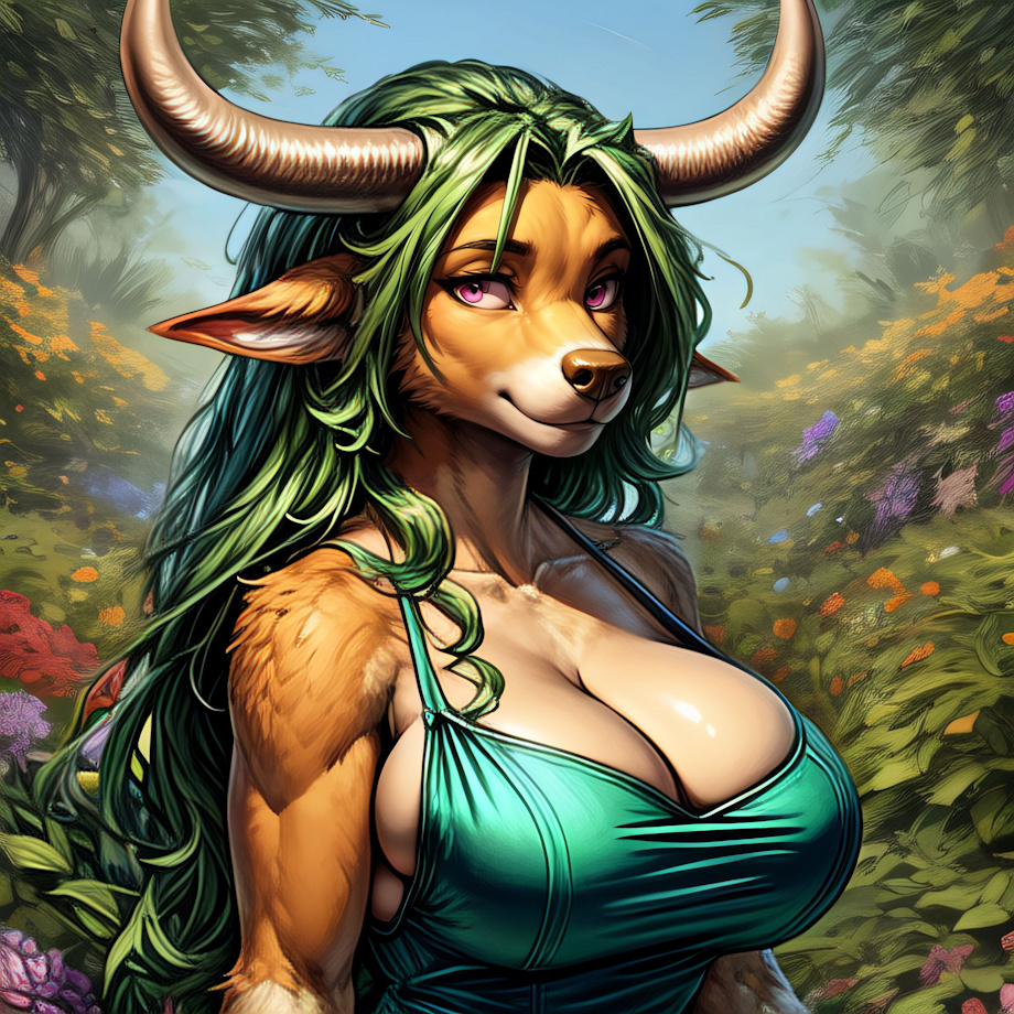masterpiece, best quality <lora:(1) Furtastic Detailer:1> (garden background:1.4) (green dress:1.4) (closeup, upper body:1.3) BREAK a (female:1.4) (minotaur:1.4) (pink eyes:1.2) (big breasts:1.3) (green hair:1.3) (long hair:1.4) (slender:1.3) (hooves:1.4) (tan fur:1.4) (medium breasts:1.3) (sagging breasts:.3) (thick thighs, skinny legs:1.3) (pointed ears:1.3) (small tan nose:1.3) Negative prompt: bloodshot eyes, arms behind back, hands behind back, blurry, blurry background, bad anatomy, bad hands, three hands, three legs, bad arms, missing legs, missing arms, poorly drawn face, bad face, fused face, cloned face, worst face, three crus, extra crus, fused crus, worst feet, three feet, fused feet, fused thigh, three thigh, fused thigh, extra thigh, worst thigh, missing fingers, extra fingers, ugly fingers, long fingers, horn, realistic photo, extra eyes, huge eyes, 2girl, amputation, disconnected limbs, worst quality, normal quality, low quality, low res, blurry, text, watermark, logo, banner, extra digits, cropped, jpeg artifacts, signature, username, error, sketch ,duplicate, ugly, monochrome, horror, geometry, mutation, disgusting, jpeg artifacts, bad quality, jpg artifacts,badhandv4, easynegative boring_e621_v4, (nipples, nude, nudity:2) (erect nipples:2) (topless:2) Steps: 35, Sampler: Euler a, CFG scale: 7, Seed: 1738318563, Size: 768x768, Model hash: 8e2f4f1346, Model: yiffymix_v44, VAE hash: 24e650297c, VAE: furception_vae_1-0.safetensors, Denoising strength: 0.48, Mask blur: 4, CFG Rescale: 0.7, Lora hashes: "(1) Furtastic Detailer: 2e94914f676c", Version: v1.6.0 |