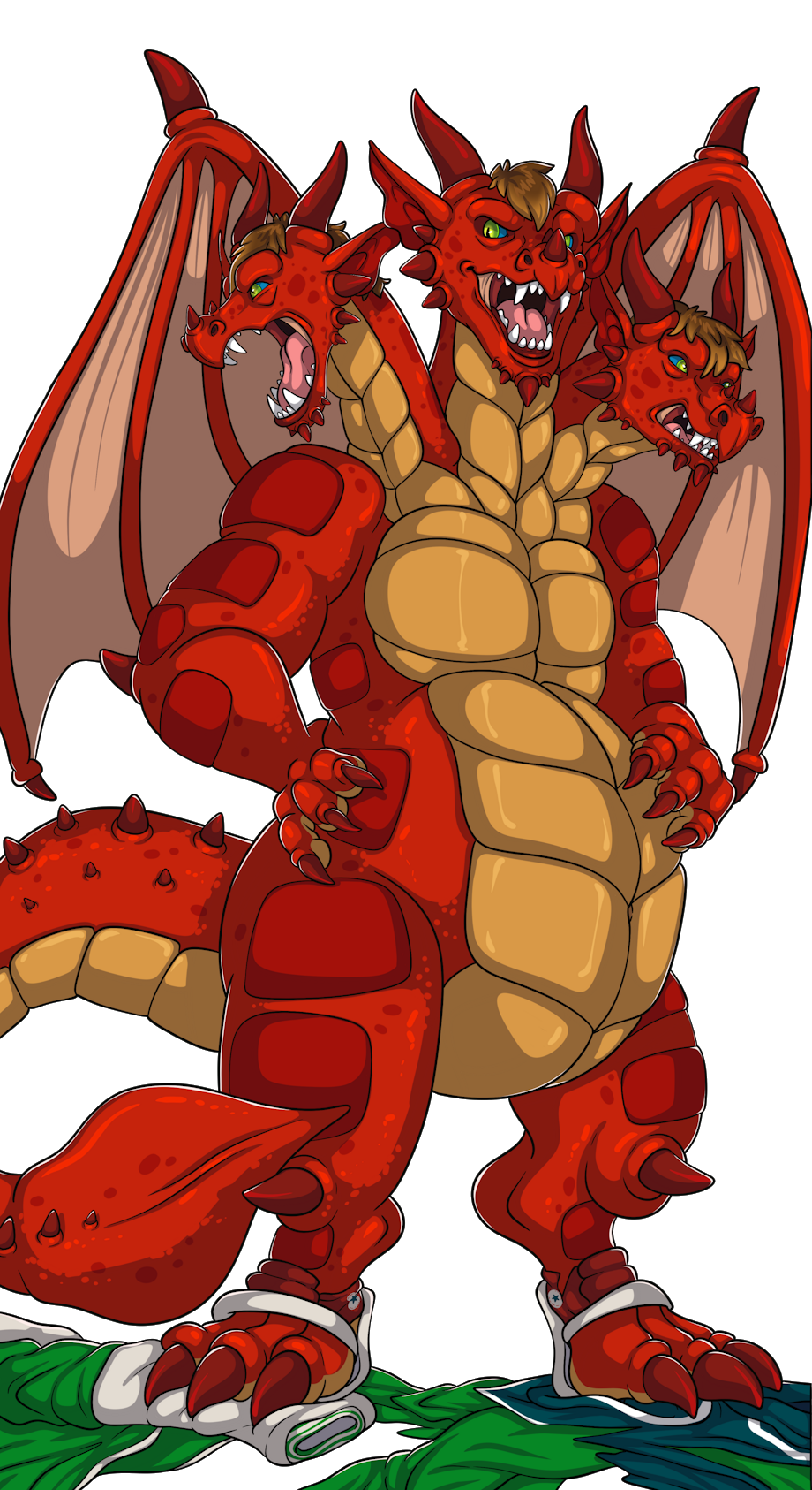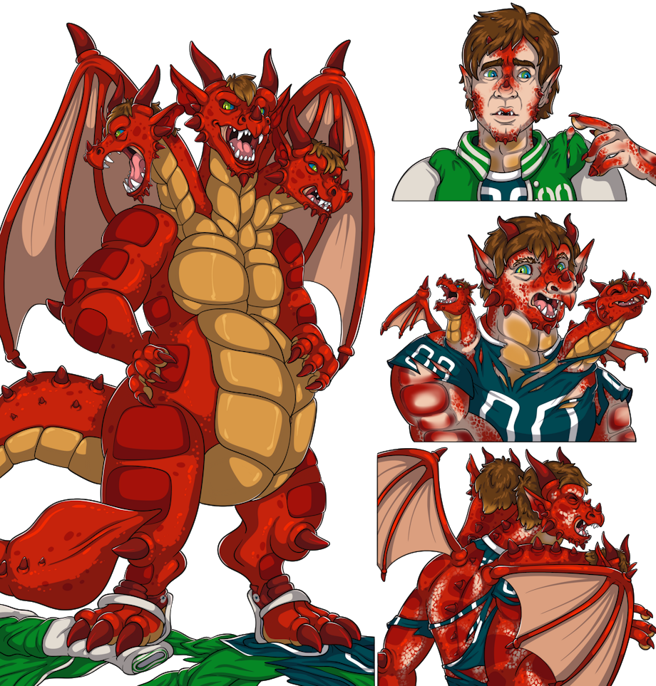 Phil closed his eyes and screamed in pain as his body continued to bulk up and his wings grew larger, shredding what remained of his jersey! He was almost fully draconic at this point, with large spikes down his back, red scales all over his body, and blonde highlights forming in his hair.